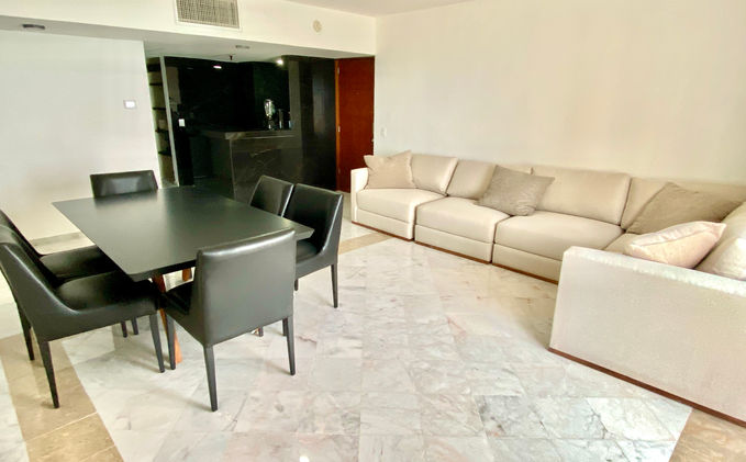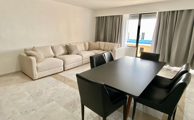 Apartamento privado de 100 m2 en el quinto piso con 2 elevadores. Tiene una terraza amplia con una pequeña piscina y VISTA AL MAR. El apartamento tiene un dormitorio con dos camas dobles. En la zona del comedor y de la sala se puede instalar un colchón inflable doble (Previa solicitud) Cuenta con un baño completo con regadera.